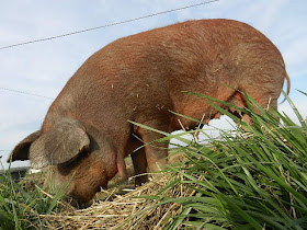 I have yet to see him do a single chore, or even make up his own nest. I pity the sow who has to put up with him when he is breeding age, because she'll never compare to mama Sophie. The two of them have a very special language. Top secret grunts and groans and whispers.